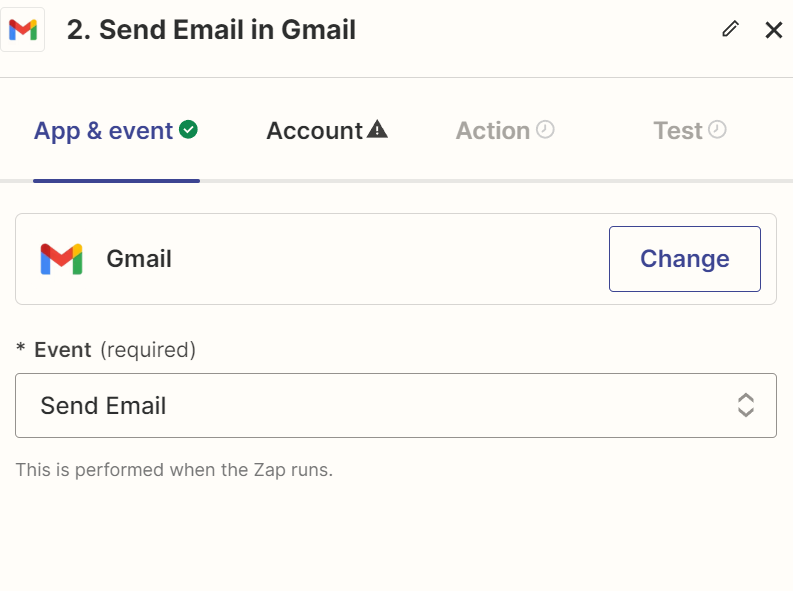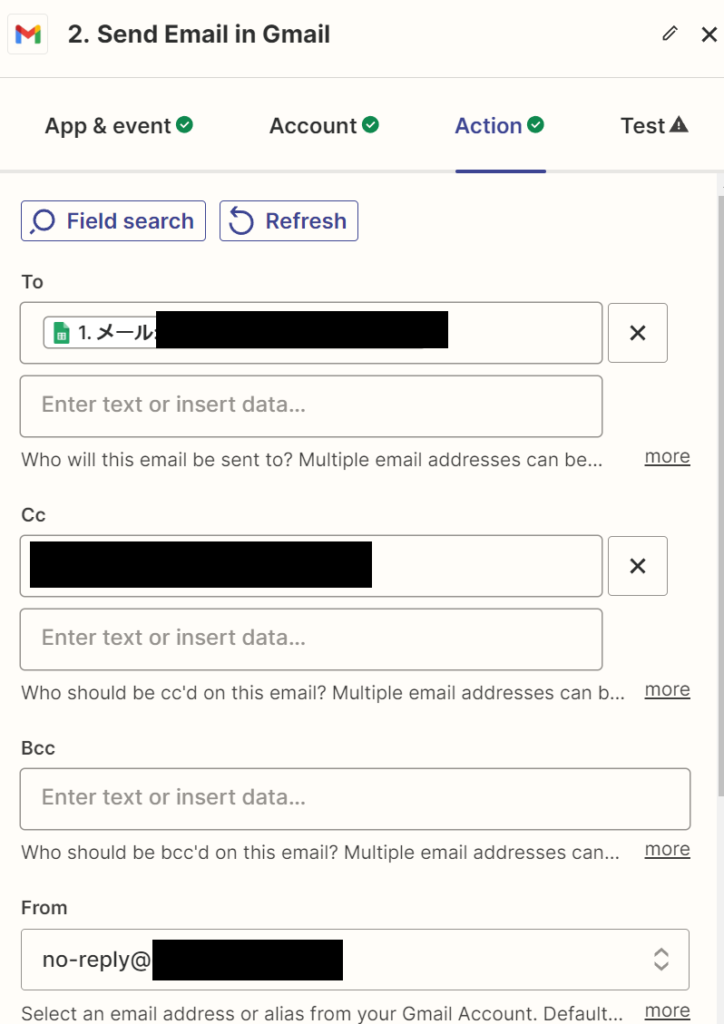 Actionの【To】にスプレッドシートのメールアドレス項目を選択して、後は転送先や送り元のアドレスやメールの内容などをお好みで記入をしていき【Continue】をクリック