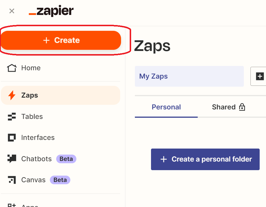 zapierメニューから【Create】クリック後【Zaps】をクリック