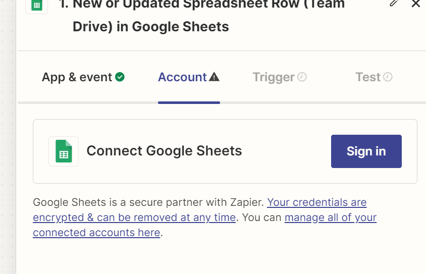 Accountでgoogleアカウントのログインを求められてる場合は連携するログインを行いzapierと連携をする(STUDIOのフォームから問い合わせの情報がたまるスプレッドシートが見れるgoogleアカウント)