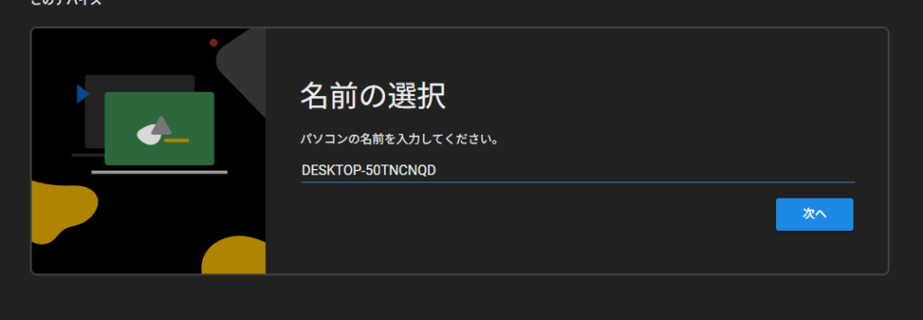 インストールが進むと、このパソコンに名前をつける画面になります。自分がわかりやすい名前(例:Work-Desktop、Main-PCなど)を入力して「次へ」を押します。