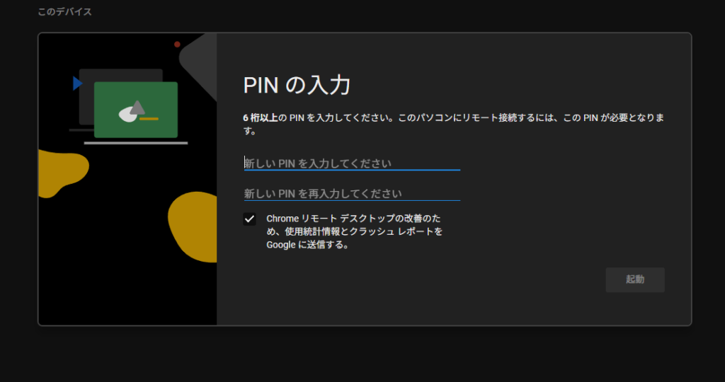 接続する際に入力する鍵となる「PIN(6桁以上の数字)」を設定します。 ※この数字は、家のPCから接続する時に必ず必要になるので忘れないようにしてください。