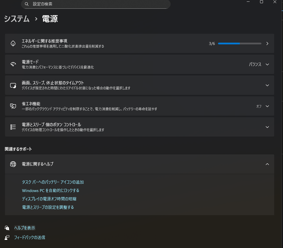 Windowsの「設定」から「システム」→「電源」を開きます。