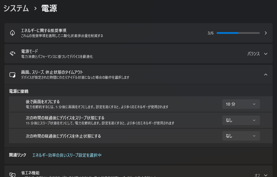 「画面、スリープ、休止状態のタイムアウト」という項目を開き、設定を変更します。