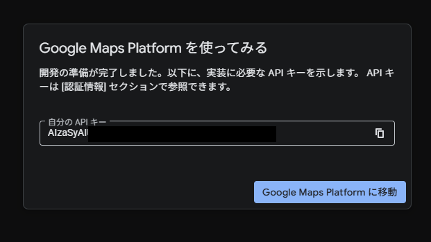 作成ボタンを押すと、「AIza…」で始まる長い文字列が発行されました。これがこのプロジェクトへの通行手形となります。