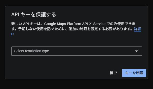 - APIの制限: このキーを使って呼び出せる機能を、今回使うMapsやSolarだけに限定します。