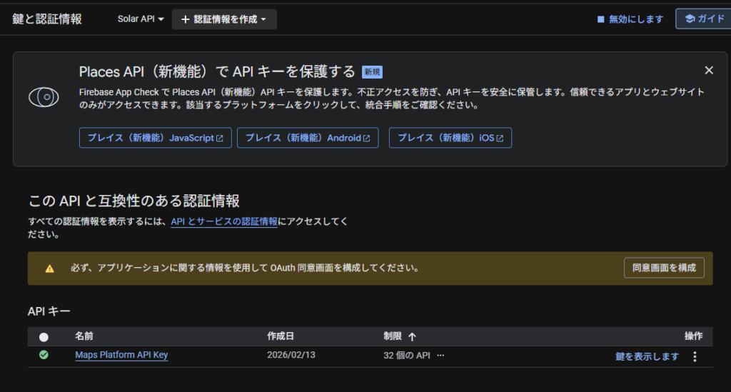 Google Cloudの仕様では、キーはプロジェクト単位で発行されます。そのプロジェクト内でMapsもSolarも有効化していれば、1つの鍵でどちらの扉も開けられる仕組みになっています。管理が楽で助かります。