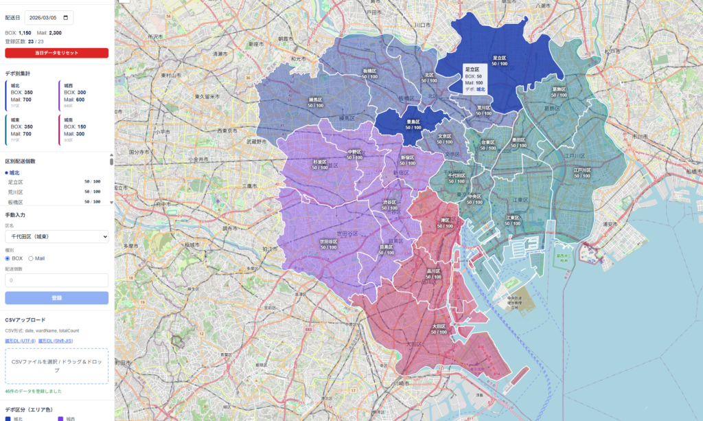 東京23区の各区への配送個数を地図上でヒートマップとして色分け表示するWebアプリケーション。CSVアップロードや手動入力でデータを登録し、日付ごとの配送状況をリアルタイムに可視化できる。