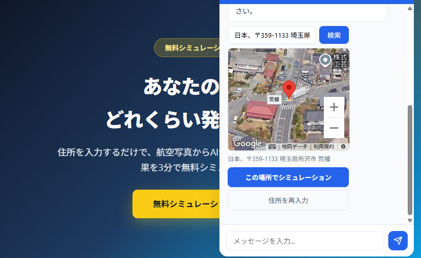 住所を入力するだけで、AIが屋根を解析し発電量・節約額・回収年数を即座にシミュレーション。PDF提案書も自動生成する埋め込み型ウィジェット。